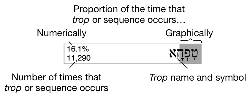 A bar graph at the bottom shows where the current trop sequence occurs in the Torah, aggregated by perek. Clicking on a perek’s bar will show the text of the p’sukim that contain that trop sequence.